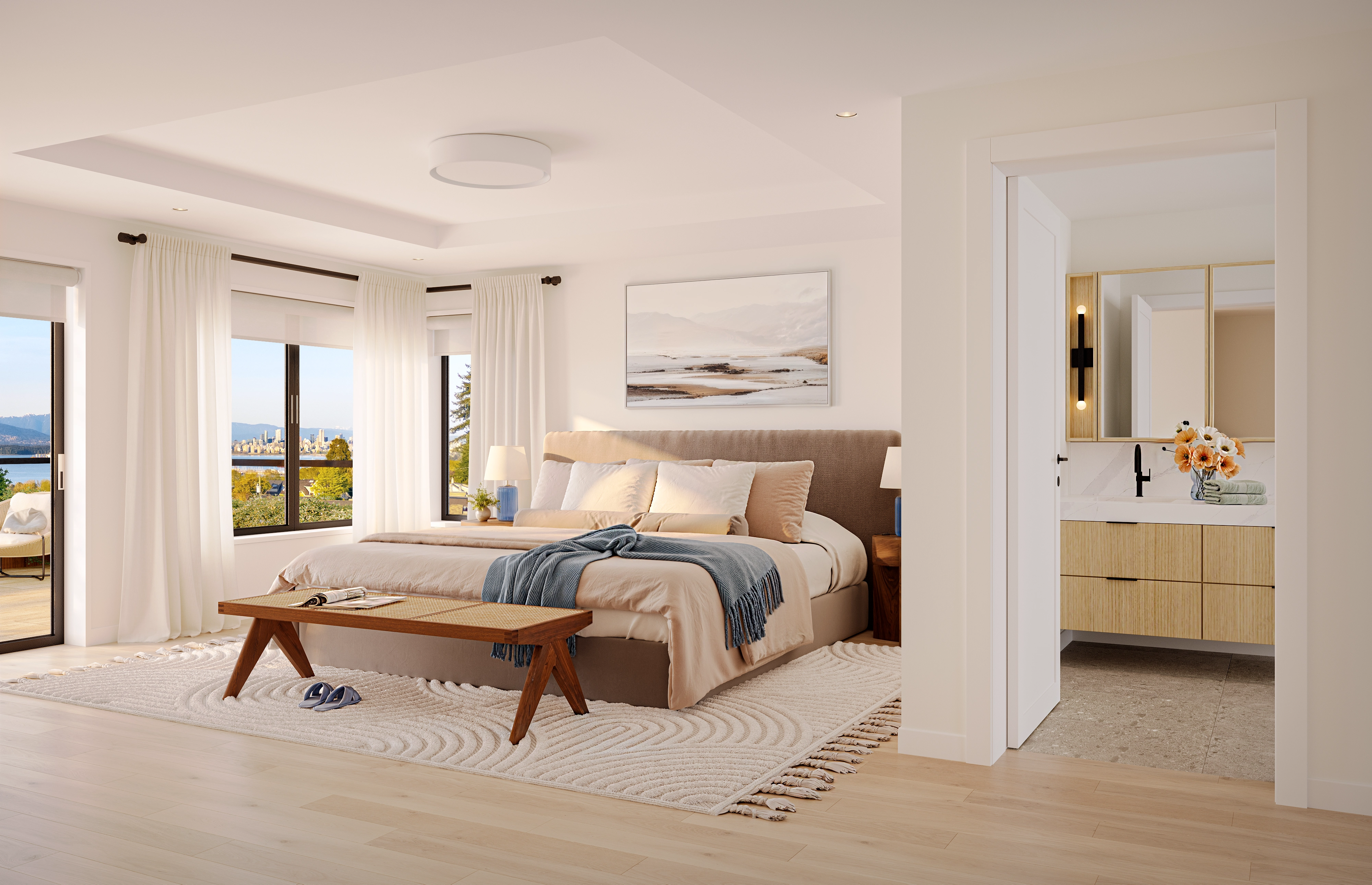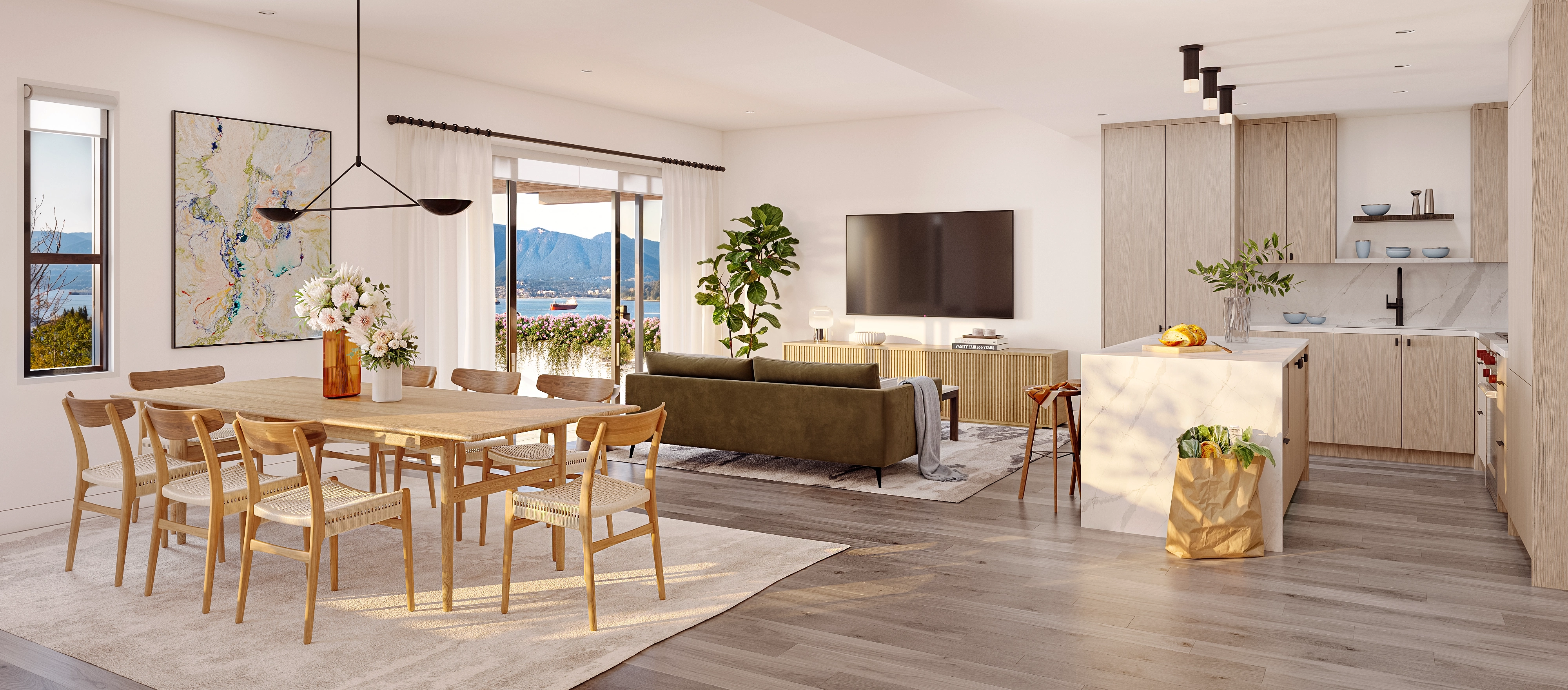 Every home is composed with proportion and rhythm. The interiors follow a philosophy of restraint, where light and material are balanced to create coherence that endures. Two palettes interpret this language with subtle contrast: one soft and airy with pale woods and light stone counters, the other textured with oak cabinetry and darker natural finishes. Both are refined yet approachable, crafted by Formwerks Interior Design.